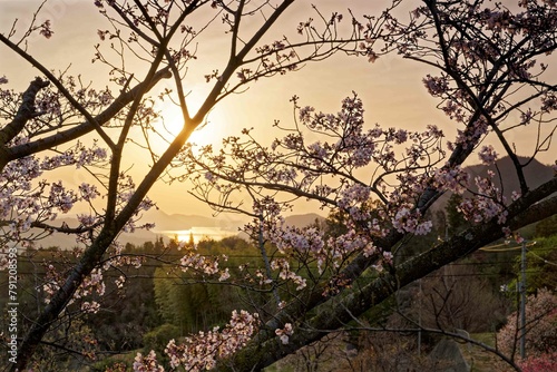 © Hitoshi, Obraz premium 瀬戸内海開山公園に登る朝日と桜
