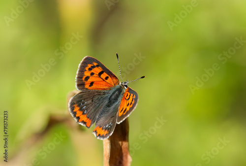 Fototapeta premium 鮮やかな草原を背景にベニシジミ蝶も愛らしく美しい姿(自然光+マクロ接写写真)