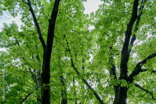 © tenpadasi, Obraz premium 雨上がりの雑木林 森の濡れた新緑の緑のコナラの木の葉 初夏・梅雨・アウトドア
