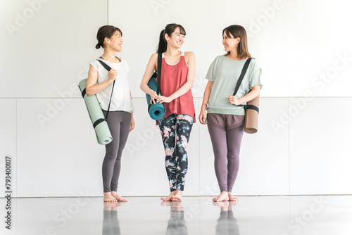 Fototapeta premium ヨガ教室に通う女友達・ママ友・インストラクター(ダイエット・ワーク運動・トレーニング・フィットネス)