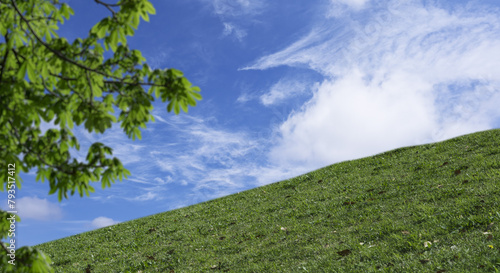 Obraz premium 春・夏 煽りで見上げた丘・土手の野原の坂道 さわやかな晴天の青空と雲の背景壁紙...