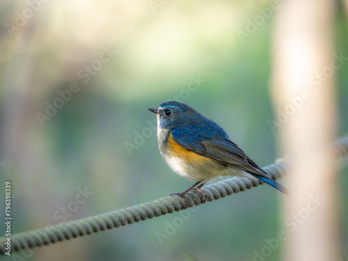 Naklejka premium 木陰のロープの上に留まってリラックスしているルリビタキの雄