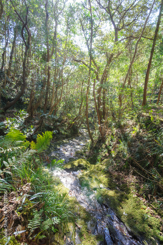 Fototapeta premium 沢沿いに繁茂するシイノキなどの広葉樹林。八丈町天然記念物、こん沢林道甌穴群(ポットホール) 三原山の中腹にあるジャングル地帯。...