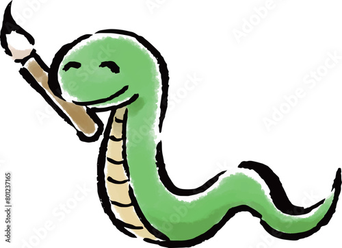 Fototapeta premium 筆を口にくわえた巳(へび) 筆タッチ手描きイラスト