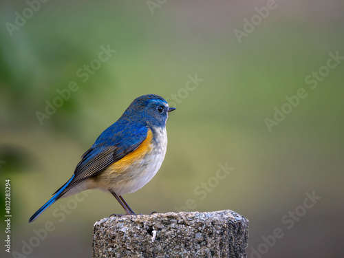 Obraz premium 木陰の杭の上に留まっているルリビタキの雄