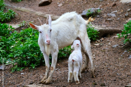 Obraz premium 母親ヤギのミルクを飲む子ヤギ