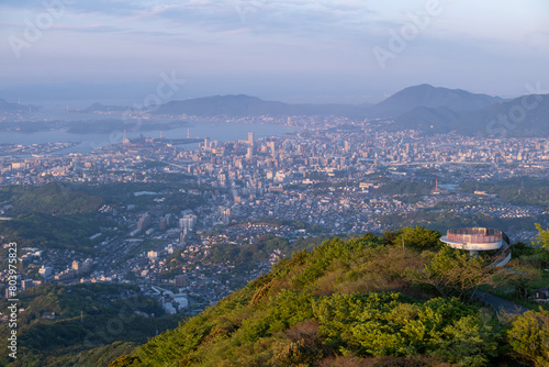 © WATA3, Obraz premium 北九州市皿倉山山頂からの夕暮れ時の北九州市小倉の展望(2024年4月)