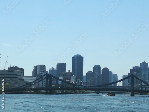 Fototapeta premium 隅田川沿いに見る清洲橋と摩天楼風景と空