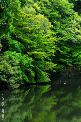 Fototapeta premium 大宮池の新緑のモミジとカモ 鳥取県 樗谿公園