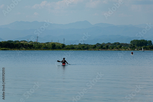 © Gottchin Nao, Naklejka premium 広い人工湖でカヌー競技をする人々