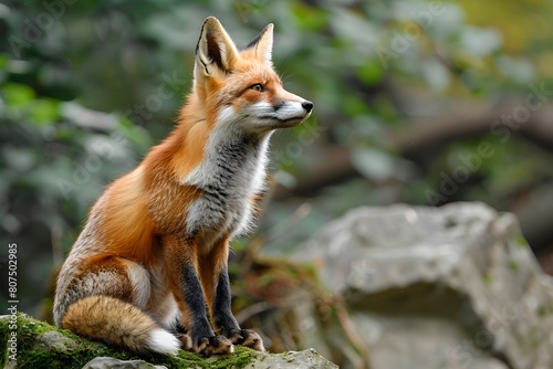 © AI Digital Artist, Fototapeta premium 숲속 돌 위에 앉아 햇빛을 쬐고 있는 작은 야생 여우