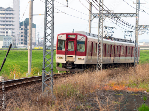 Obraz premium 川沿いを走る近鉄道明寺線の電車