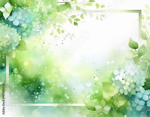 Fototapeta premium 水彩テイストの緑の紫陽花のフレーム