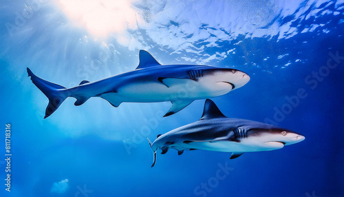 Obraz premium 太陽の光が溶け込む青い海を泳ぐサメ