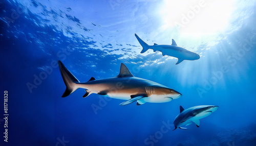 Obraz premium 太陽の光が溶け込む青い海を泳ぐサメ