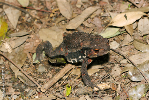 © SAIGLOBALNT, Naklejka premium 森の中、夕刻の枯葉上を移動するニホンヒキガエル(雌・自然光+ストロボ、マクロ接写撮影)
