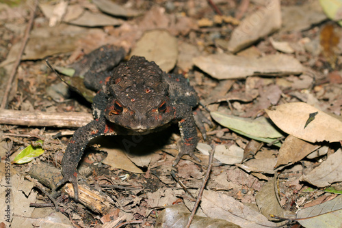 © SAIGLOBALNT, Fototapeta premium 枯葉上を移動するニホンヒキガエル(雌・自然光+ストロボ、マクロ接写撮影)