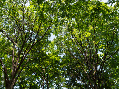 Obraz premium 空を覆う鮮やかな新緑の樹木