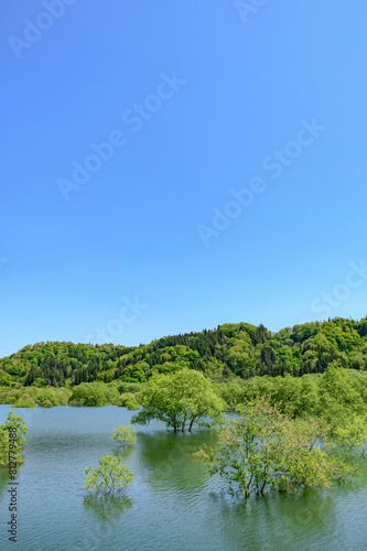 © rujin, Fototapeta premium 白川湖 青空と残雪と新緑の水没林
