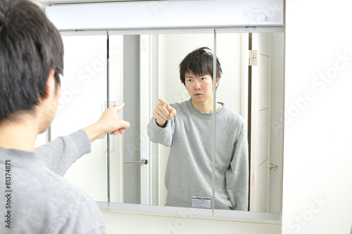 © beeboys, Fototapeta premium 朝起きて自宅の洗面台の鏡に映る眠そうな自分を見つめる日本人男性