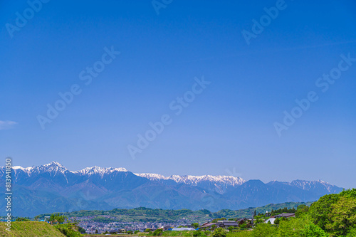 Obraz premium 春の北アルプスと山岳都市