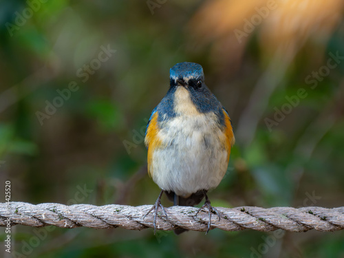 Obraz premium 木陰のロープの上に留まっているルリビタキの雄