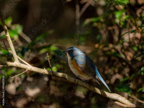 Fototapeta premium 森の中の木陰で枝に留まっているルリビタキの雄