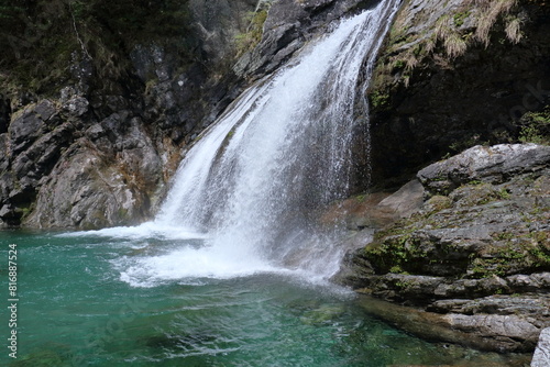 © mitumal , Obraz premium エメラルドグリーンの滝壺に落ちる水 (高知県 土佐町 アメガエリの滝)