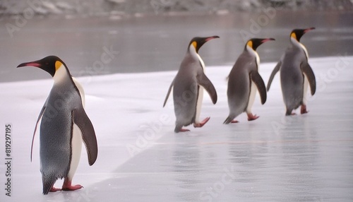 Obraz premium 氷上を行進するペンギンたち - 極寒の大地での可愛らしいひととき