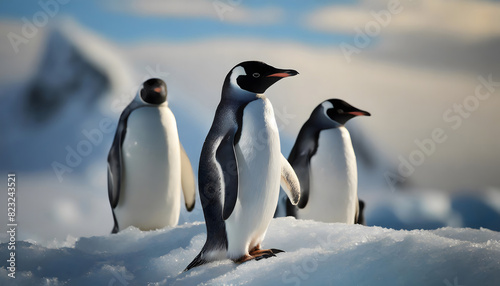 Naklejka premium 氷に囲まれた寒い場所で立っている3匹のペンギン