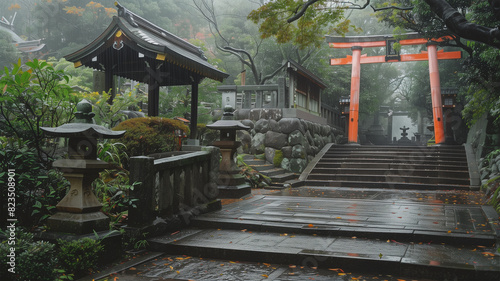Naklejka premium 神社と雨 梅雨