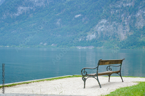 Fototapeta premium 自然豊かなハルシュタットの雄大な景色を眺められるベンチ