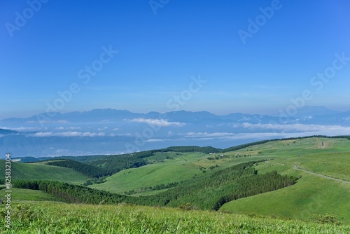 © Scott Mirror, Obraz premium 車山高原から見た山並みとグリーンに包まれたドライブウェイのコラボ情景
