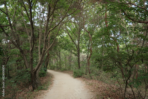 Fototapeta premium 대한민국 산의 봄의 울창한 숲속의 나무와 식물들이 만연한 등산로를 경험할 수 있는 공원 산책길 배경화면