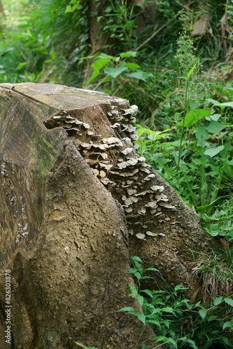 Obraz premium 切り株に生えるキノコ縦構図