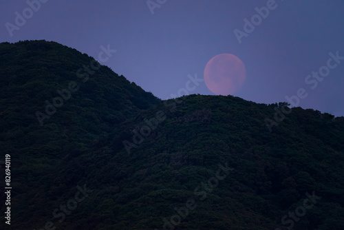 © Kouzi.Uozumi, Obraz premium 夜明けの空で落ちてゆく赤い立待月が山に触れる20240525-1