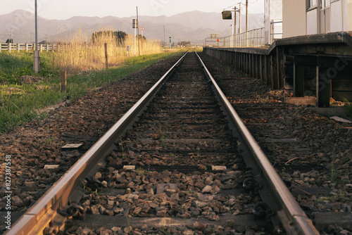 © Keiichi Wakui, Fototapeta premium 夕暮れせまる景色の中真っ直ぐ伸びる線路