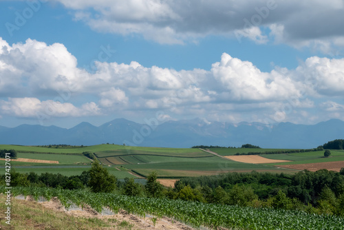 © kinpouge, Fototapeta premium 夏の畑作地帯と山並み 十勝岳連峰