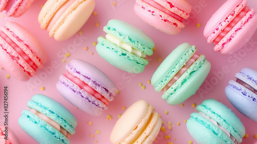 Obraz premium たくさんのカラフルなマカロン ピンク背景