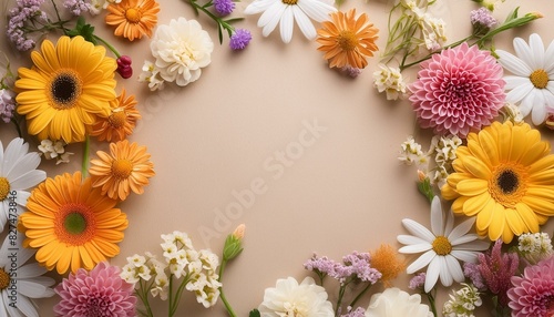 Obraz premium 薄いピンクの紙テクスチャを囲うように彩る花々