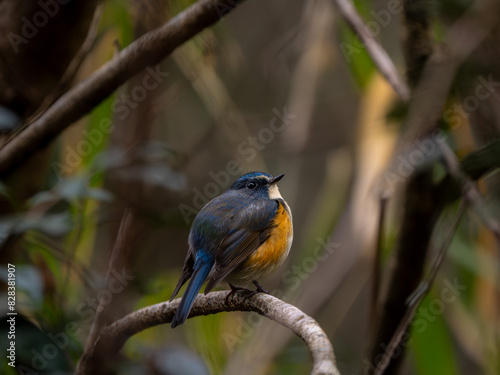 Obraz premium 森の中で枝に留まっているルリビタキの雄