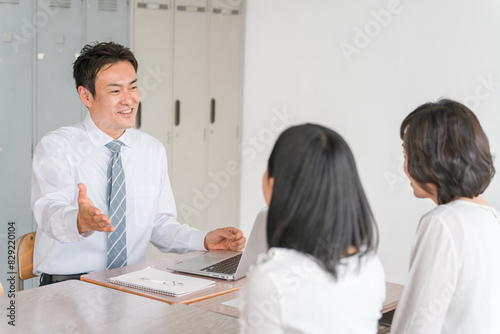 Obraz premium 学校の教室で三者面談をする男性担任教師と女子生徒と保護者の母親