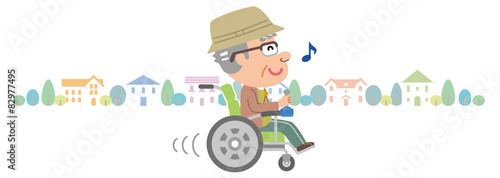Obraz premium 電動車椅子 高齢者 おじいさん 家並み