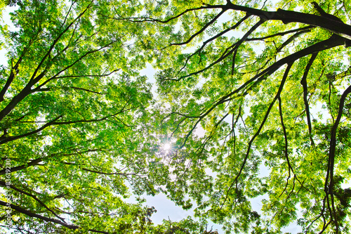 Obraz premium 新緑の林と太陽