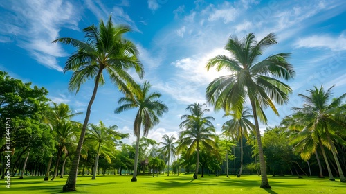 © StudioFF, Obraz premium 青い空を背景に高いヤシの木がある美しい緑豊かな熱帯公園