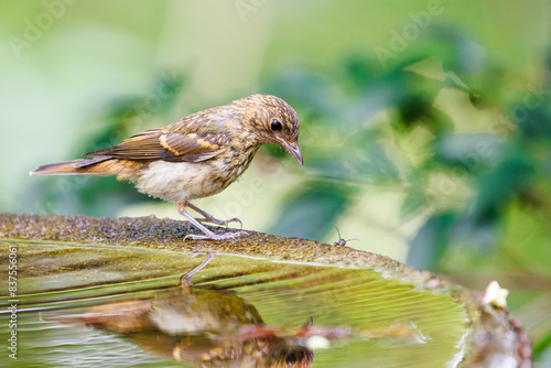 Fototapeta premium 泉で水浴びをする可愛いキビタキ(ヒタキ科)の幼鳥。日本国神奈川県秦野市、弘法山公園、権現山バードサンクチュアリにて。 2022年7月撮影。