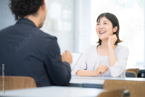 © kapinon, Obraz premium 学校や塾との保護者面談のイメージ 子どもの成績が良くて喜ぶ親 進路や塾の相談のイメージ