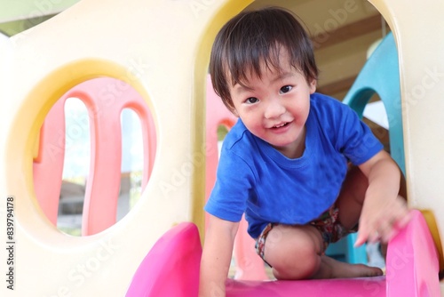 © bluecamera, Fototapeta premium 滑りだいをすべる外の公園で遊ぶ日本人の男の子