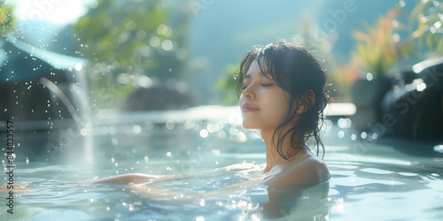 © JIN KANSA, Obraz premium のんびりと山間の露天風呂に入る若い女性