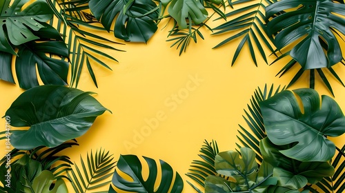 © StudioFF, Naklejka premium 黄色の背景に緑の葉で囲まれたフレーム